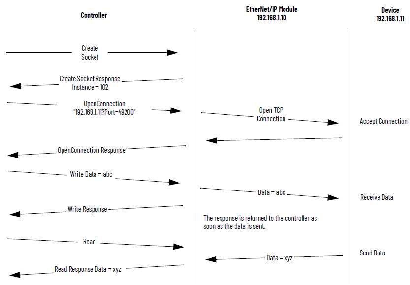 El siguiente diagrama muestra una secuencia típica de transacciones de interfaz de socket con el controlador Logix 5000 que actúa como cliente TCP. Cada transacción entre el controlador Logix 5000 y el módulo EtherNet/IP es una instrucción de mensaje (MSG). En el siguiente ejemplo, el controlador Logix 5000 envía datos a un dispositivo y luego el dispositivo envía una respuesta. Esta secuencia de Las transacciones son típicas. Dependiendo del protocolo de aplicación, el dispositivo puede enviar datos al controlador Logix 5000 una vez que la conexión está abierta.