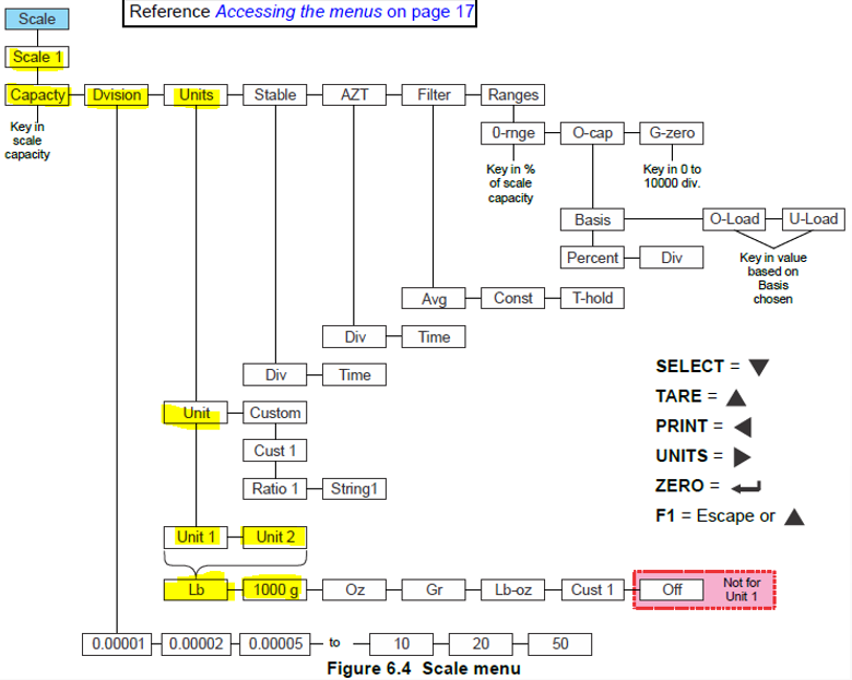En el menú de "Scale" debemos indicar la capacidad de la celda de carga, la resolución del peso que queremos que muestre el indicador y las unidades deseadas.