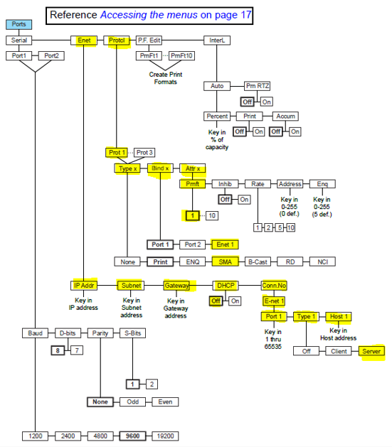 Dentro del Menú "Ports" debemos de selecionar que la comunicación será por "Enet", y se recomienda configurar según se requiera, siguiendo los párametros marcados en amarillo en la siguiente imagen.