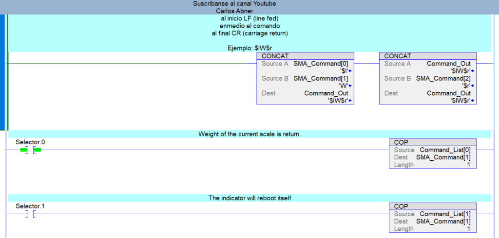 En la rutina de "SMA_Commands" hay 2 ejemplos con 2 comandos, uno para saber el peso actual medido y otro para reiniciar el indicador. Se debe de seleccionar solo 1 comando, en este caso esta seleccionado el comando "Command_List[0]"que contiene "W".