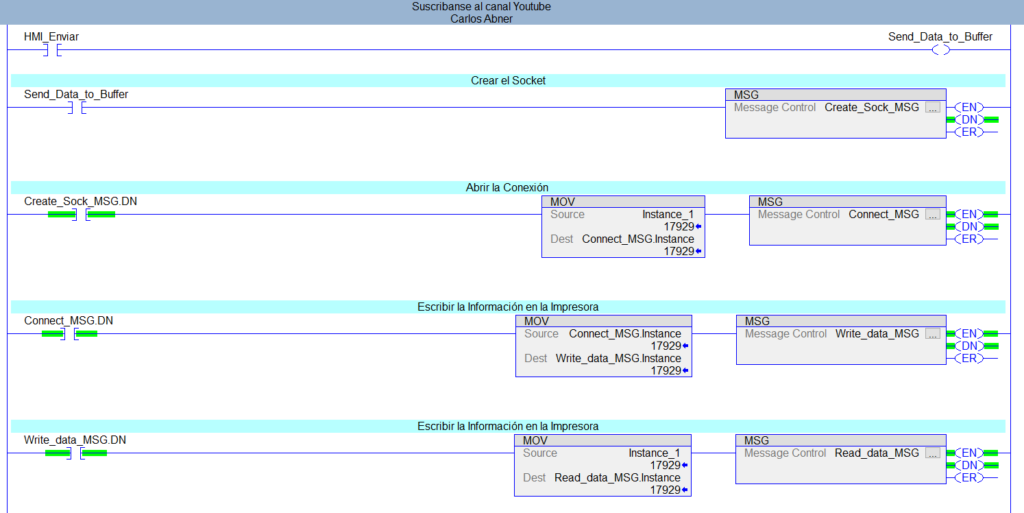 Por último vamos a la rutina "PLC_to_TCP_Server" y activamos el contacto "HMI_Enviar" que se encuentra en la línea 1.