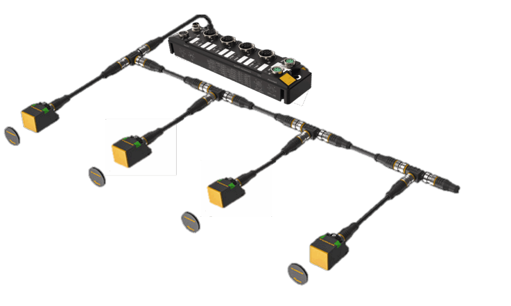 Para esta práctica utilizaremos un puerto en modo BUS, con cuatro cabezales RFID conectados para crear una red como la de la siguiente imagen.